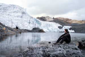 Tourist man looking at the Pastoruri Glacier in one of the highe