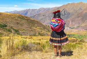 An indigenous Peruvian Quechua lady looking at the Andes Mountai