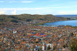 Aerial View of Puno Cityscape and Lake Titicaca as Seen from the